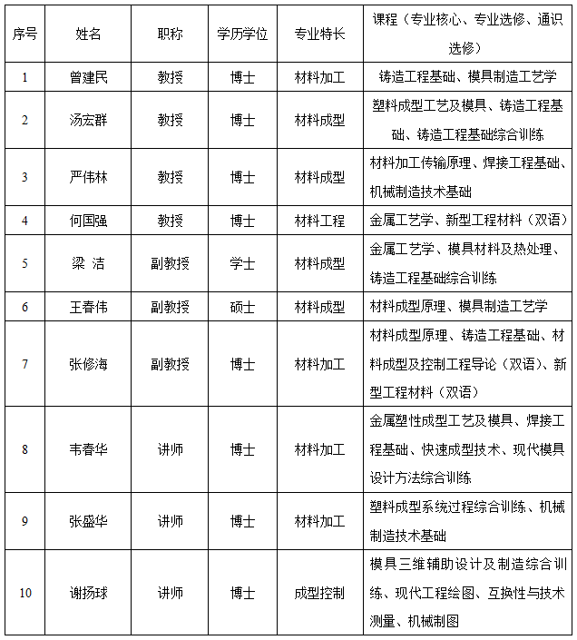 (4)讨论课程、校内外合授课程:塑料成形系统过程综合训练、铸造工程基础综合训练