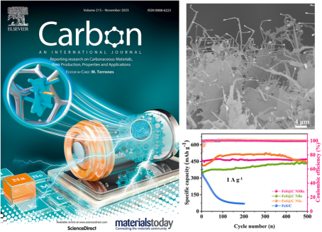 朱金良副教授在钠离子电池材料研究方面取得进展,研究成果以“Carbon encapsulated FeS nanosheet-nanoribbon interwoven sandwich structure as efficient sodium-ion battery anodes”为题发表在国际学术期刊《Carbon》(2023, 215, 118469, IF=10.9),并入选该期封面。论文通讯作者为朱金良副教授,第一作者为硕士研究生符芳和胡淼。该研究工作得到了国家自然科学基金和广西自然科学基金的支持。