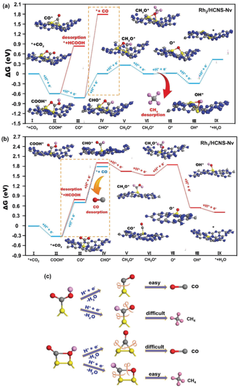 与单原子位催化剂(SAC)相比,双原子位催化剂(DAC)具有更高的金属含量和更灵活的活性位点,具有更好的性能。该研究工作首次在具有N空位的松散多孔g-C3N4空心纳米球上合成了Rh2 DAC,并将其应用于光催化CO2还原反应,克服了目前电子-空穴复合速率低的限制,延长了光生载流子的寿命。中空纳米球的高比表面积有利于Rh2双原子对的均匀分散和锚定,而N 空位则诱导了载体与Rh2双原子对之间形成稳定的3N/Rh-Rh/1N2C配位。利用Fukui函数和双描述符对催化剂分子的局部三-s-三嗪环单元结构的电子迁移进行模拟计算,发现具有N空位的支撑骨架上的局部电荷倾向于通过3N/Rh-Rh/1N2C桥转移到Rh2双原子位上,使富集电荷的Rh2双原子位点成为反应的活性中心,提高了Rh2 DAC的电荷分离效率。与Rh1 SAC相比,考虑到光激发态的密度泛函理论(DFT)计算证实,Rh2 DAC能有效稳定限制速率的中间体CHO*,并能很好地削弱CH3O*物质中的C-O键强度,促进CH4的生成和分离,从而获得较高的CO2还原效率和高达91.65%的CH4电子选择性。Rh2 DAC通过形貌和空位演化双重优化机制,对改善光学系统中光催化CO2还原活性和CH4选择性的性能至关重要。该研究成果创新性地提供了Rh2 DAC的制备方法,启发了形态、元素空位和金属双原子活性位点的功能组合,从而实现了有效催化。