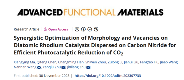 论文引用:Ma, X., Chen, Q., Han, C., Zhou, S., Li, Z., Liu, J., Hu, F., Wang, J., Wang, N., Zhu, Y., Zhu, J., Synergistic Optimization of Morphology and Vacancies on Diatomic Rhodium Catalysts Dispersed on Carbon Nitride for Efficient Photocatalytic Reduction of CO2. Adv. Funct. Mater. 2023, 2307733.