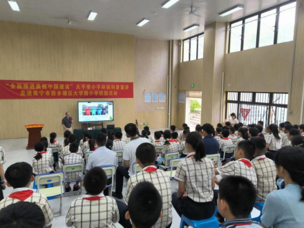 6月5日上午,学院副院长孙翔、吴烈善教授及辅导员罗盛柳等老师组成科普小团队到南宁市大学路小学进行环保科普宣讲。吴烈善教授作为主讲嘉宾,通过一个个鲜活的案例,生动讲解水资源利用、垃圾分类等环保科普知识。同时科普小团队以小游戏的方式与同学们开展环保互动,让小学生们在游戏环节中体验环境保护的重要意义。