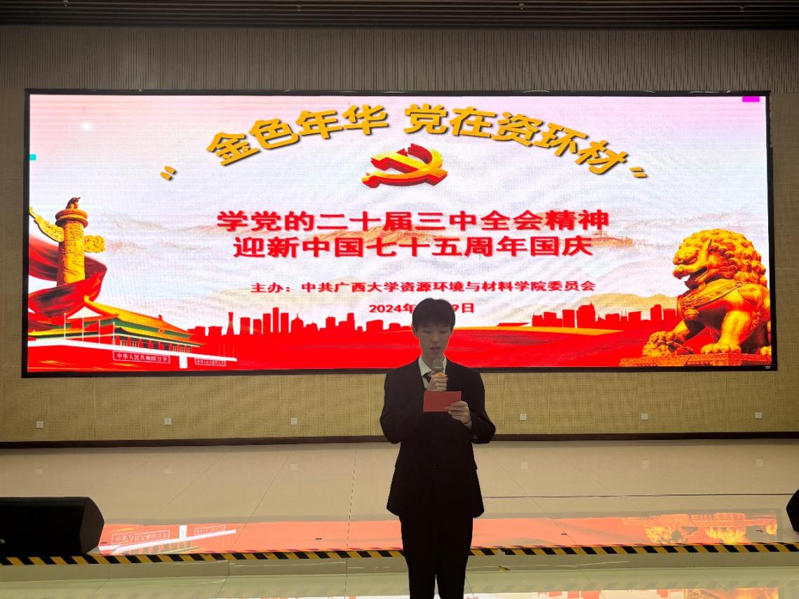 党委组织开展“金色年华·党在资环材”系列活动之“学党的二十届三中全会精神,迎新中国七十五周年国庆”主题党日活动。学院党委书记沈大强,党委副书记、常务副院长冯庆革,副院长罗能能、孙翔出席活动,学院各党支部师生党员代表参加活动。