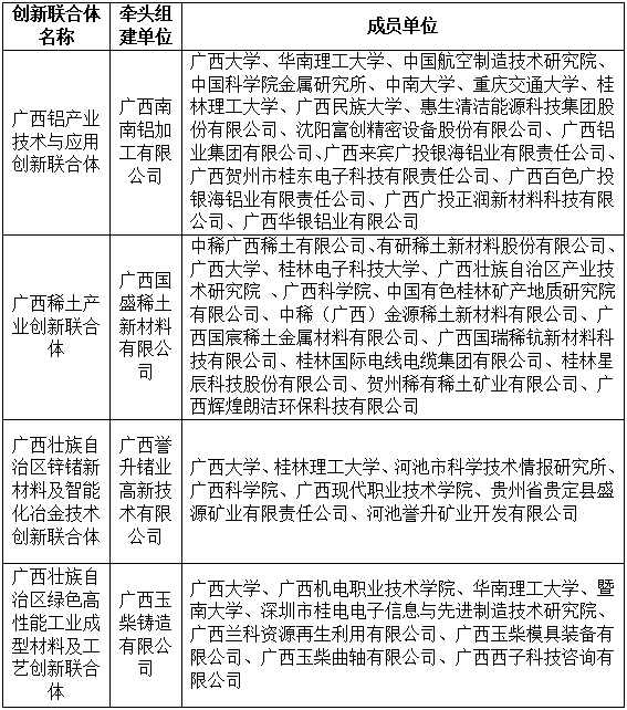 科研团队联合的有4项,涵盖铝产业、稀土产业、锌锗新材料及智能化冶金技术、绿色高性能工业成型材料及工艺等多个领域,包括:广西铝产业技术与应用创新联合体、广西稀土产业创新联合体、广西壮族自治区锌锗新材料及智能化冶金技术创新联合体、广西壮族自治区绿色高性能工业成型材料及工艺创新联合体。创新联合体分别由广西南南铝加工有限公司、广西国盛稀土新材料有限公司、广西誉升锗业高新技术有限公司、广西玉柴铸造有限公司四家龙头企业牵头组建,汇聚了成人电影