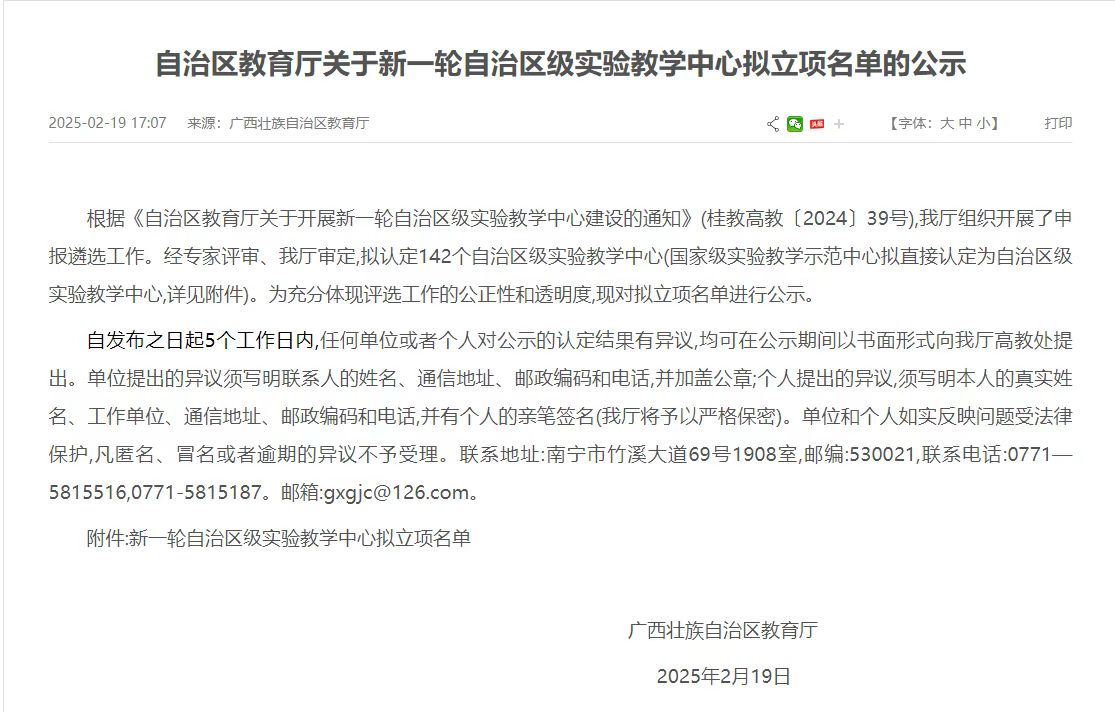 根据《自治区教育厅关于开展新一轮自治区级实验教学中心建设的通知》(桂教高教[2024]39号),区教育厅组织开展了申报遴选工作,经专家评审,区教育厅审定,成人电影