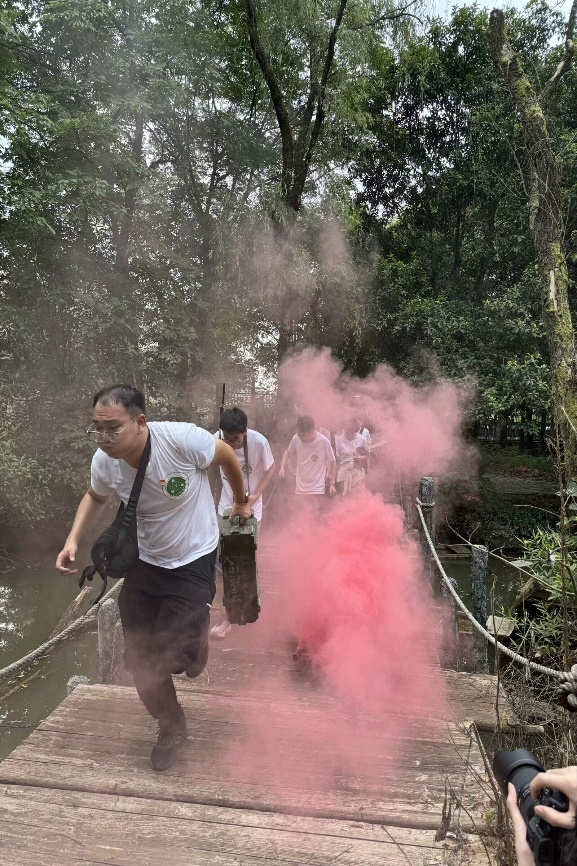 13日下午,实践团师生参观了红军长征突破湘江烈士纪念碑园,瞻仰群雕和纪念碑,朗诵赞歌、鞠躬并手写寄语表达敬仰;参观湘江战役纪念馆后,实践团师生们在园内教官的指导下模拟长征路线,合作书写红色标语,体验湘江战役搭门板渡江,重走长征之路,感悟血与火的战斗历史。通过集体朗诵“告英烈书”,书写寄语,系红飘带,向革命英烈们致以崇高的敬意。