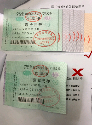 原始凭证粘贴单”上,写清楚单据张数和金额,由经费项目负责人、经办人和验收人签字。发票不允许贴在粘贴单装订线的左边,票不能贴在票的上面,以免票面信息被粘住看不见,每张发票都要贴在粘贴单上。