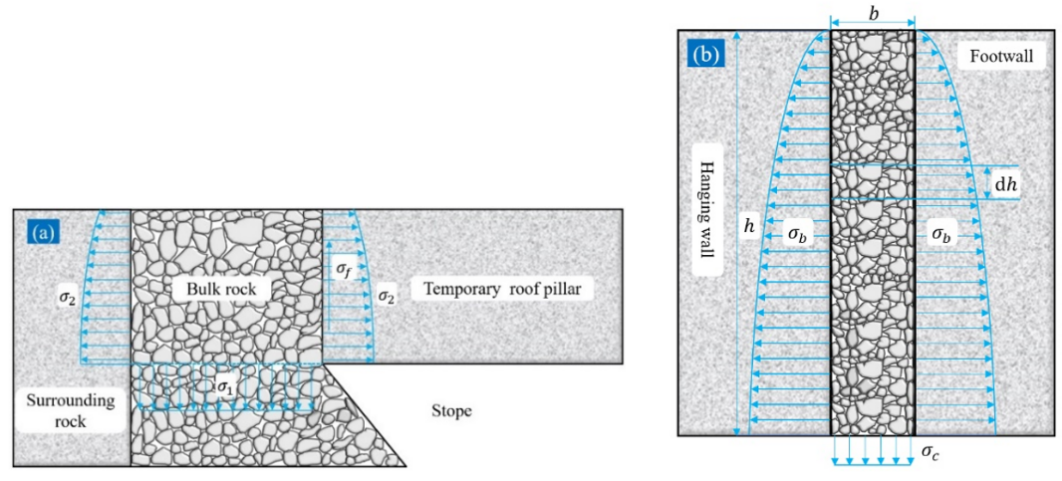 论文“A New Combined Mining Method: The Stope Limit Length Calculation of Considering Bulk Support Boundary”的第一作者和通讯作者均为陈庆发教授。研究团队采用MRMR法对矿岩体稳固程度进行评价,结合岩体稳定性图,确定出矿岩的稳定水力半径区域和初始崩落水力半径;根据首采场、循环诱导崩落采场空区暴露形态分析,得到上盘围岩、矿石顶柱与下盘围岩的水力半径计算公式;基于循环诱导崩落采场存在散体边界支撑条件,通过将散体边界的散体支撑力与原岩应力比值,作为水力半径弱化系数,得到弱化后的水力半径用于循环诱导崩落采场极限长度计算;结合已确定的采场结构参数,求解得到首采场、循环诱导崩落采场的临时顶柱的极限暴露长度参数。