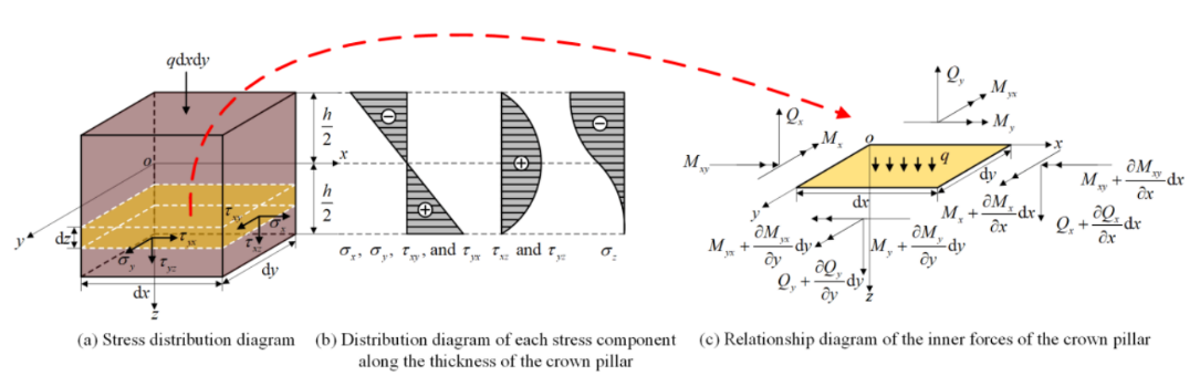 论文“Temporary Roof Pillar Cyclic Induced Collapse: Beam Mechanics Analysis of Thickness and Limit Length”的第一作者为2024级博士研究生杨文雄,通讯作者为陈庆发教授。研究团队从梁力学的角度,将首采场和循环诱导崩落过程中的临时顶柱,分别简化为固支梁和悬臂梁的弹性力学问题,建立受力荷载力学模型;推导出符合拉剪应力极限强度控制条件下的临时顶柱厚度与极限长度的对应关系,分别确定出首采场和循环诱导崩落过程中的临时顶柱最佳长厚比。