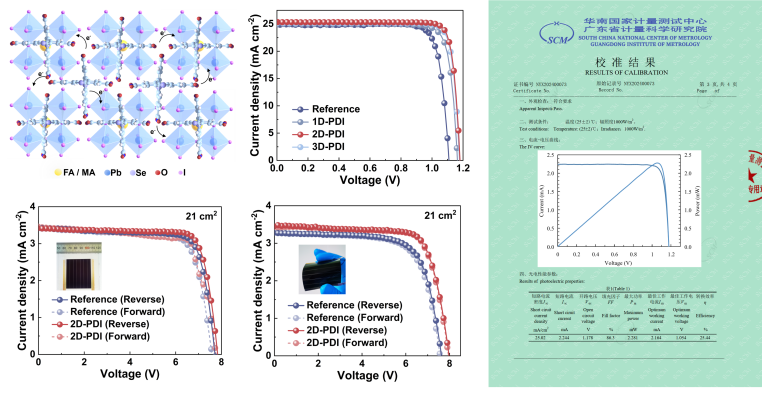 新型的卤化物半导体钙钛矿太阳电池(PSCs)凭借其低成本、可溶液加工和优异的光电性能等优势而迅速发展起来,越来越无限接近市场。然而,反式(p-i-n)PSCs仍存在相对较大的开路电压(VOC)损耗,这主要是由于强极性钙钛矿薄膜或界面上存在严重的非辐射复合,以及弱n型钙钛矿特性所导致的非平衡电荷传输所致。本文中研究团队设计了三种不同维度的基于苝二酰亚胺(PDI)的有机小分子,包括1D-PDI、2D-PDI和3D-PDI,以此作为掺杂剂制备n型钙钛矿薄膜。含有硒(Se)的PDI分子具有很强的给电子能力,能有效地扩大钙钛矿内部的准费米能级裂分(QFLS),抑制快速非辐射弛豫。此外,PDI分子还能通过共轭骨架包覆在钙钛矿表面形成“晶格笼”,从而钝化本体缺陷,减少局域陷阱,提高n型掺杂效率以及钙钛矿器件的稳定性;加入2D-PDI后,小面积太阳电池的能量转换效率(PCE)达到了26.06%(认证效率为25.44%),VOC为1.18V,填充因子高达87.23%。刚性和柔性钙钛矿太阳电池模组也分别实现了21.48%和20.71%的PCE(孔径面积为21cm2)。这一新发现证明了这种维度调控策略能有效设计n型掺杂和制备高性能反式钙钛矿太阳电池,为未来技术应用提供了新思路。