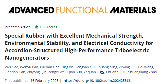 “结构热力学与微纳化工”课题组在特种橡胶的研制与应用方面取得突破,研究成果以“Special Rubber with Excellent Mechanical Strength, Environmental Stability, and Electrical Conductivity for Accordion-Structured High-Performance Triboelectric Nanogenerators”为题发表在国际顶级学术期刊Advanced Functional Materials上。论文第一作者为成人电影