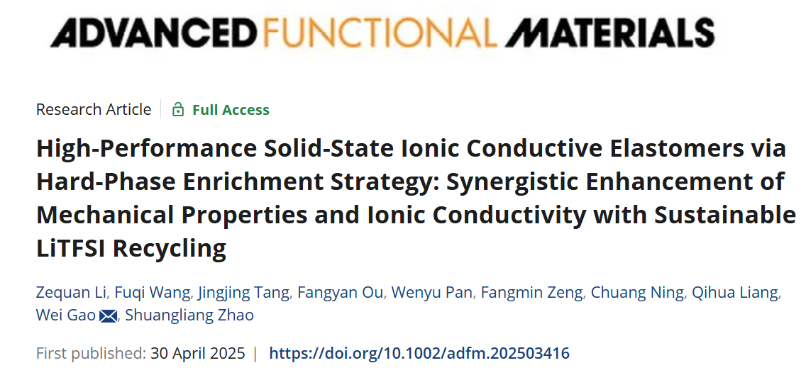 “高分子及结构板材”团队在固态离子导电弹性体研究方面取得新进展,研究成果以High-Performance Solid-State Ionic Conductive Elastomers via Hard-Phase Enrichment Strategy: Synergistic Enhancement of Mechanical Properties and Ionic Conductivity with Sustainable LiTFSI Recycling为题,发表在国际知名期刊Advanced Functional Materials上。文章第一作者为助理教授李泽权,通讯作者为副教授高伟,成人电影
