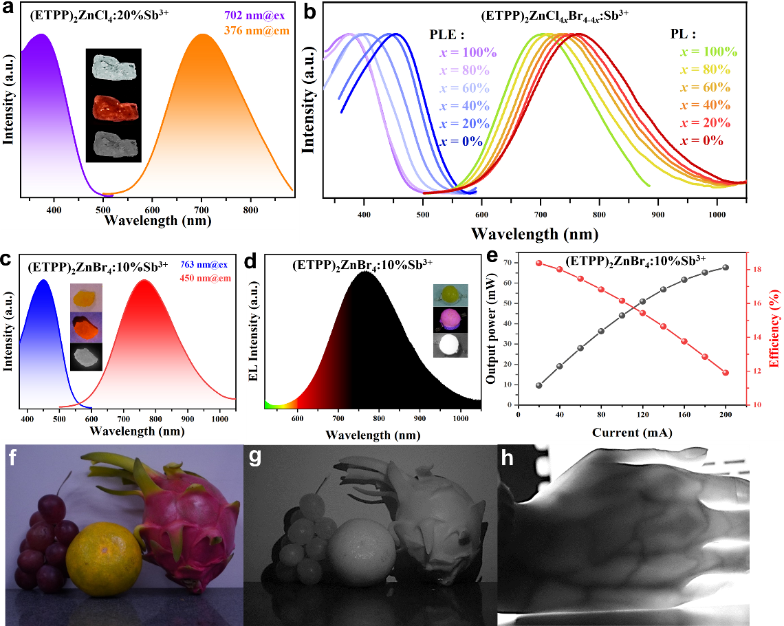 目前,低维无铅金属卤化物由于其可调的发光性质和优异的环境稳定性而获得了广泛的关注,然而其发光主要集中在可见光区域。基于此,团队骨干彭辉带领学生创新性地提出配位结构和卤素取代策略,协同调控低维无铅金属卤化物的光物理性质,成功实现了在蓝光激发下的高效近红外发光,发光效率高达55.4%。随后,将制备的荧光粉与商用蓝光LED芯片相结合,制备了高性能近红外光源,成功展示了其在夜视和生物成像领域中的应用 (Adv. Funct. Mater. 2024, 34, 2411807)。
