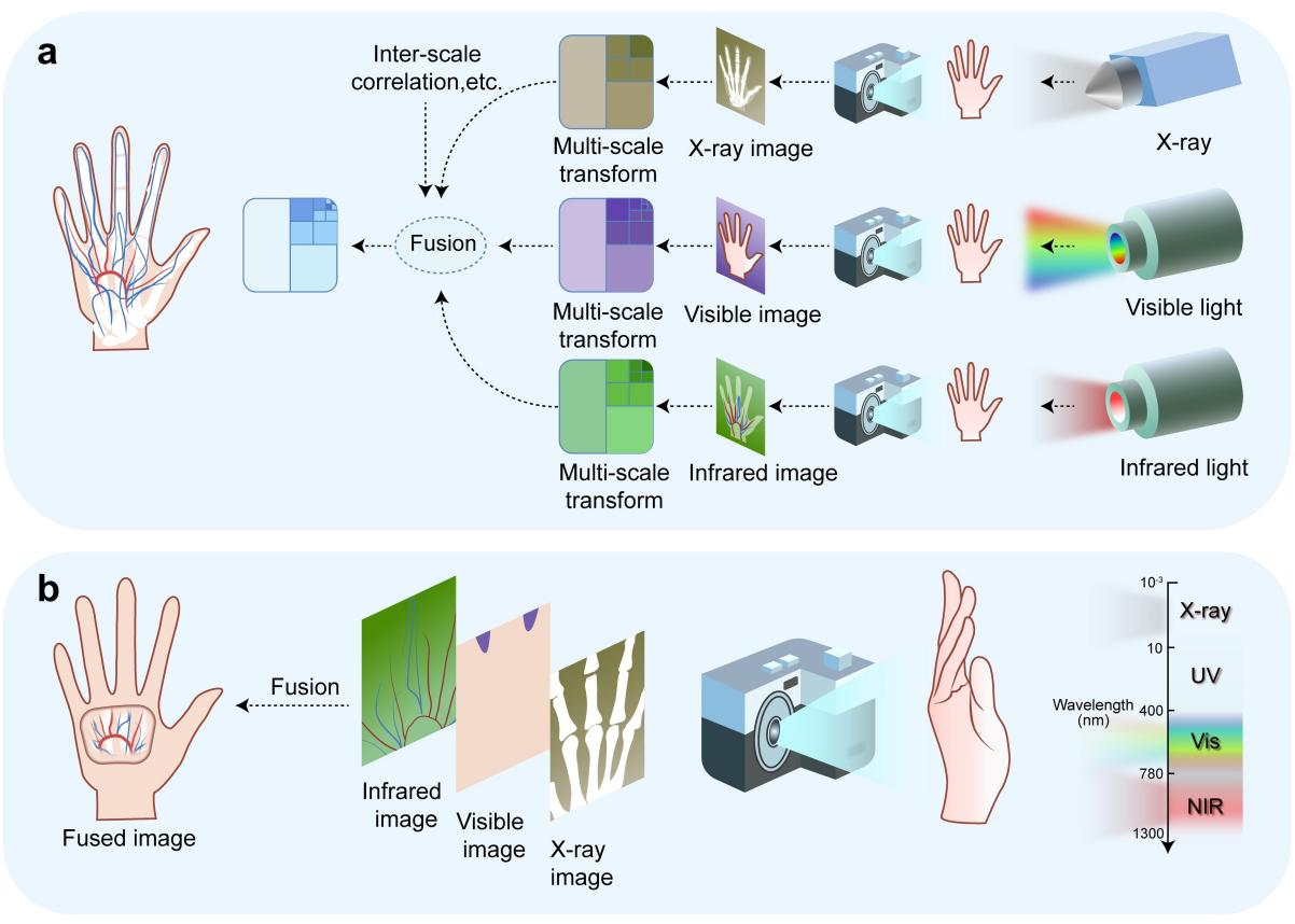 多光谱图像融合技术可以优化和整合不同类型的光谱,以获得更全面、可靠和丰富的特征数据,从而提高模型预测的准确性和稳定性。为此,彭辉等带领学生开发了一种具有超宽发射的新型Sb3+掺杂Zn2+基金属卤化物,成功在单一化合物中实现了高效的白光发射、近红外发射和X射线辐射发光。基于其独特的发光性质,成功实现了其在像素级多光谱图像融合中的应用(Adv. Funct. Mater. 2025, 2424915)。
