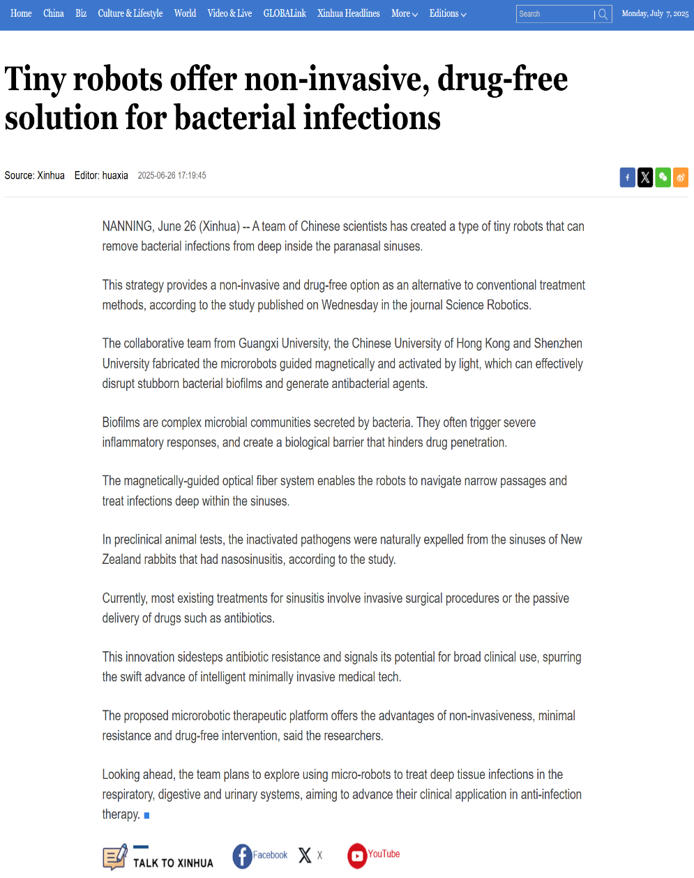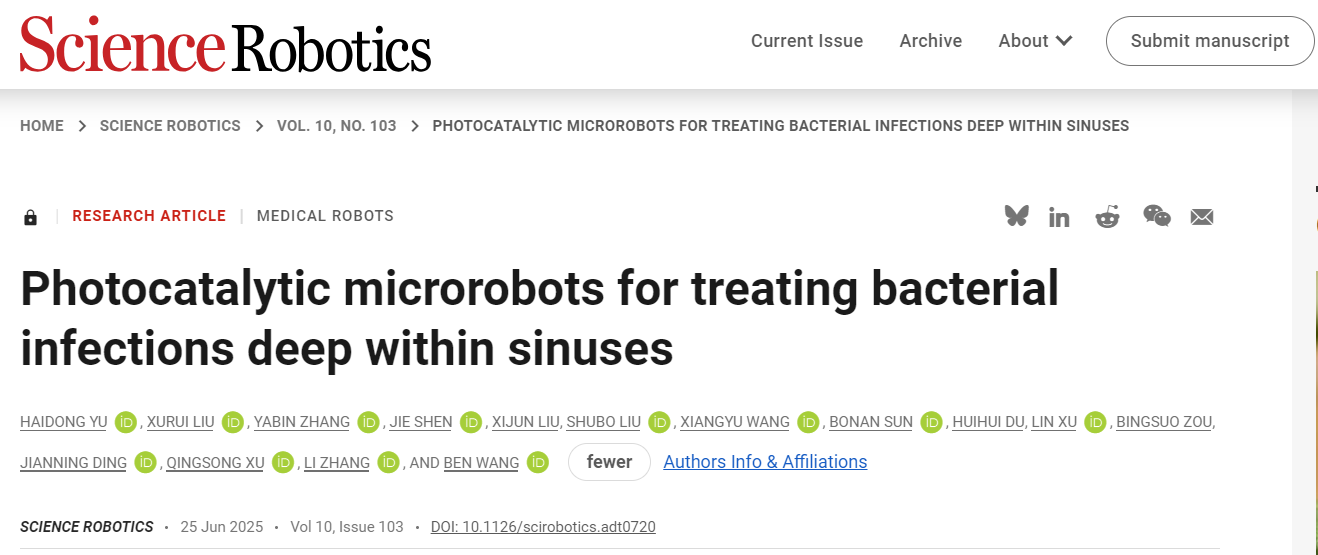 针对深部组织生物膜感染引发的炎症问题,研究团队受自然界Janus结构启发创新性设计了一种基于Cu单原子的光催化微型磁驱动机器人(CBMRs),在磁控系统辅助下构建出光磁协同微创治疗策略。该策略融合磁导航与光催化双重功能,CBMRs可在外部磁场驱动下灵活穿行至感染区域,并在光纤引导的可见光激发下产生高效抗菌活性氧,实现生物膜99%以上的去除率。这种治疗效果也在新西兰兔鼻窦炎动物模型中进行了进一步验证。CBMRs展现出优异的运动稳定性与显著的治疗效果,治疗后相关组织恢复良好,体现出优异的生物相容性。该技术为深部感染的精准治疗提供了新思路,也为微型机器人在复杂体腔环境中的智能应用提供了重要示范,未来有望拓展至呼吸道、消化道与泌尿道等多种场景。研究成果以“Photocatalytic microrobots for treating bacterial infections deep within sinuses”为题发表在Science子刊Science Robotics(IF 27.5)上,由张亚斌教授小组联合香港中文大学张立教授和深圳大学王奔副教授共同完成,成人电影